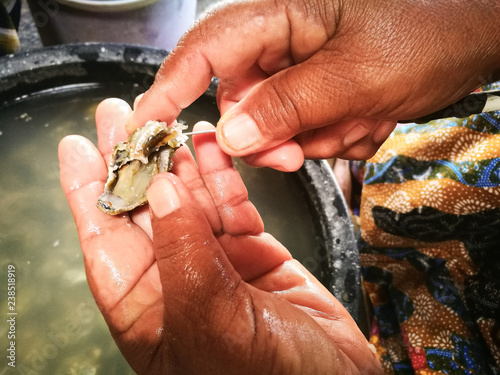 © Kohyao, Fototapeta premium Hand holding knife to peel it off shell