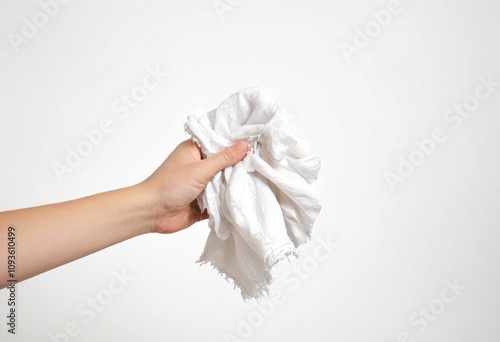 Obraz premium Hand holding napkin on white background