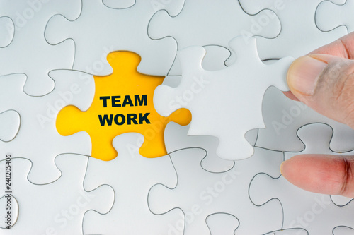 © instagram.com/_alfil, Fototapeta premium Hand holding piece of jigsaw puzzle with word TEAMWORK. Selective focus
