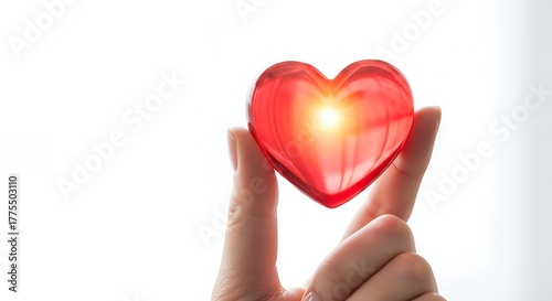 Fototapeta premium Hand Holding Red Heart with Bright Light Reflection in Bright White Background