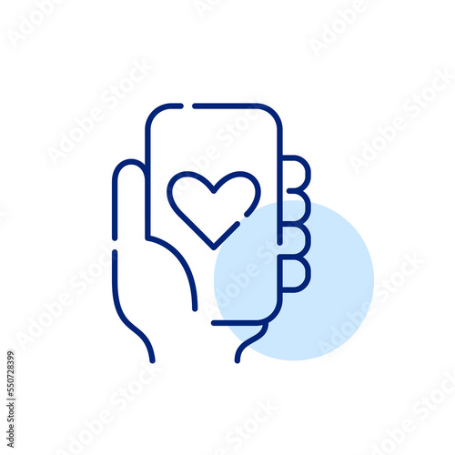 Obraz premium Hand holding smartphone with a heart symbol on screen. Pixel perfect, editable stroke line icon