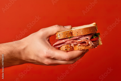 Fototapeta premium Hand holding tasty sandwich on a red background