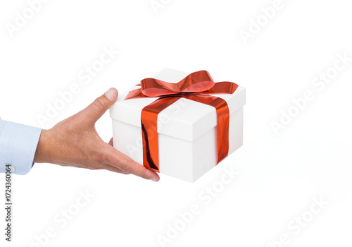 Obraz premium Hand holding white gift box with glossy red ribbon and bow in plain white studio