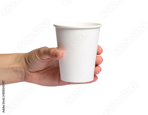 © PNGwallet, Obraz premium Hand holding white paper cup mockup disposable coffee cup drink on transparent background