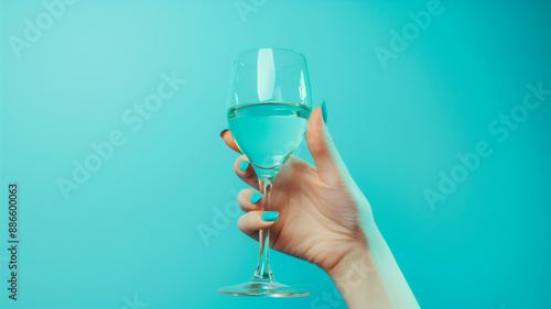 Obraz premium Hand holding wine glass with water against turquoise background