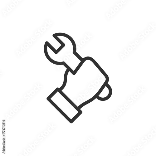 © Matsabe, Obraz premium Hand holding wrench, linear icon. Repair service and technical assistance. Line with editable stroke.