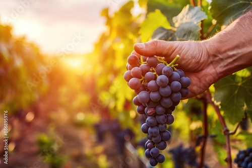 © miss irine, Obraz premium Hand holds bunch of dark purple grapes with green leaves. Vineyard landscape blurred in warm sunset glow. Human hand picks ripe fruit. Close up shot on sunny day.
