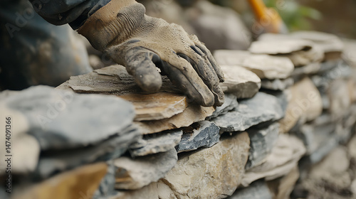 © LorelEino, Obraz premium Hand in Glove Laying Stone Wall