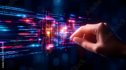 © Dibani, Obraz premium Hand interacts with digital data stream; futuristic tech background; concept for AI, software, or data processing