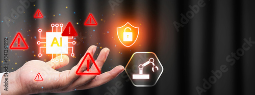 © Leo Lintang, Naklejka premium Hand is holding glowing icons representing AI, security, and automation, surrounded by warning symbols, suggesting potential dangers. Concept of artificial intelligence risk management