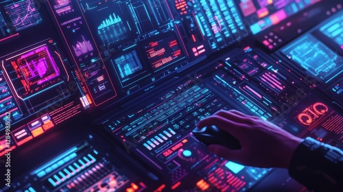 © Justlight, Obraz premium Hand navigating a complex futuristic computer interface with glowing neon lights, displaying data visualizations, charts, and graphs in a cybersecurity context
