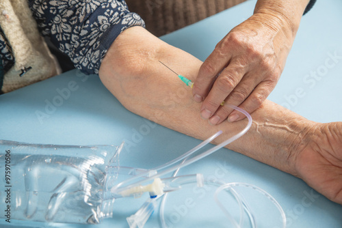 © andranik123, Obraz premium Hand of elderly patient with IV drip with infusion bag.