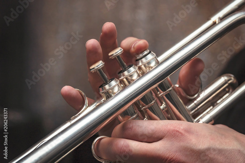 Obraz premium Hand of the Trumpeter on the buttons of trumpet