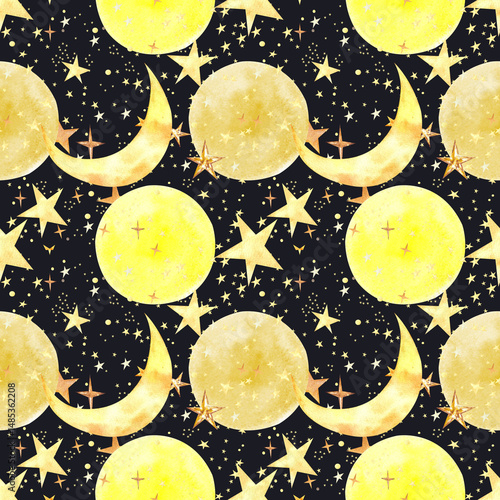 © Елена Нефидова, Naklejka premium Hand Painted Celestial Pattern with Stars and Moons