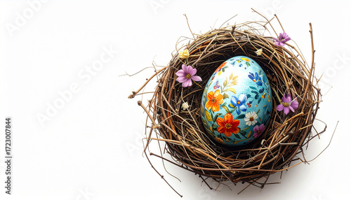 © Athiphat, Obraz premium Hand painted Easter egg with colorful floral patterns sits in rustic bird nest decorated with small flowers, symbolizing spring celebration and creativity