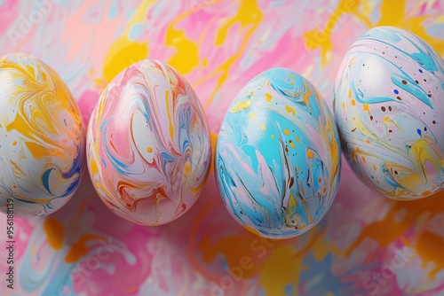 © Anjali, Fototapeta premium Hand painted Easter eggs on colorful pastel background.