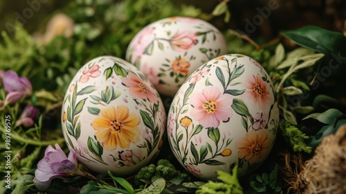 Fototapeta premium Hand-painted Easter eggs with delicate floral designs, surrounded by fresh spring foliage.