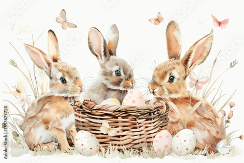 © nikolettamuhari, Obraz premium Hand-painted Easter rabbits with basket and spring flowers – watercolor art