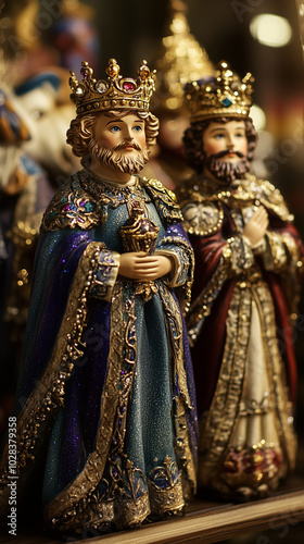 © Nadya, Fototapeta premium Hand-painted king figurines with intricate detailing, adorned with gold crowns and robes, rich textures of fabric and jewels, standing on a decorative shelf