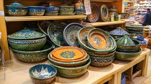 Fototapeta premium Hand-painted pottery display, shop shelves, artisan crafts, market background