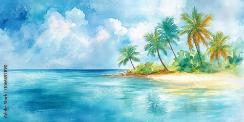 Fototapeta premium Hand painted watercolor of a tropical island with turquoise waters, palm trees, and soft sands