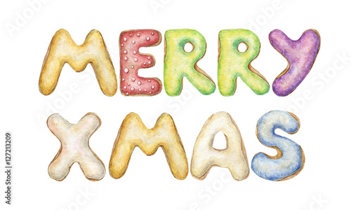© Lileinaya, Naklejka premium Hand painted watercolor words Merry Xmas donut alphabet isolated on white. Xmas lettering