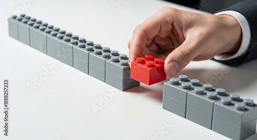 © sumbayana, Fototapeta premium Hand Places a Red Lego Brick in a Row of Gray Lego Bricks on White Table.