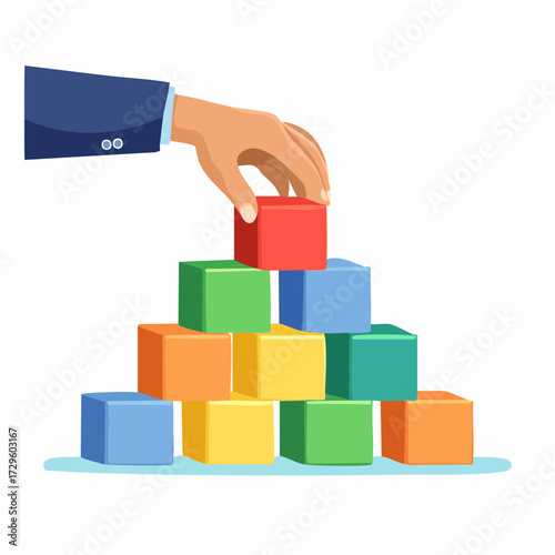 © Mandan, Fototapeta premium Hand Placing Colorful Building Block on Top of a Stacked Pyramid Against White Background
