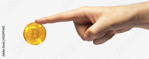 Fototapeta premium Hand pointing at a gold bitcoin coin.