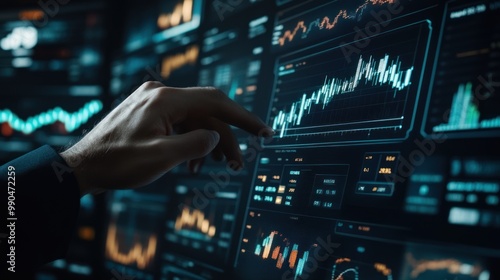 © h4kunA, Obraz premium Hand pointing at financial data on a computer screen.