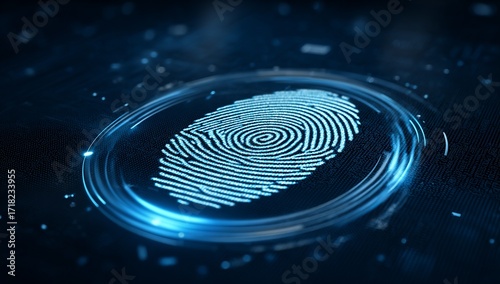 Obraz premium Hand Pressing Blue Futuristic Touchscreen Button with Digital Interface...