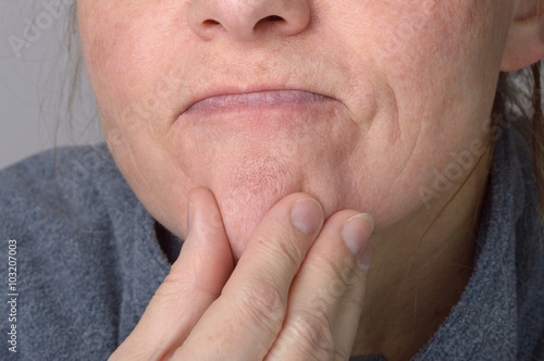 © fpic, Fototapeta premium Hand reibt Kinn beim Überlegen