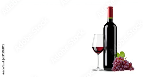 Fototapeta premium Hand rendered red wine bottle grape bunch and glass composition on white backdrop