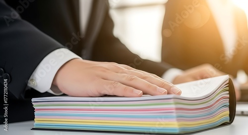 © Nasim, Obraz premium Hand resting on colorful document stack documents papers