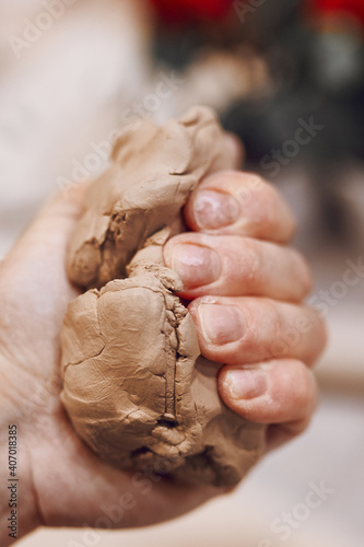 Obraz premium Hand squeezes a piece of clay. Woman preparing clay to make pottery at table in workshop. Handmade Design Art