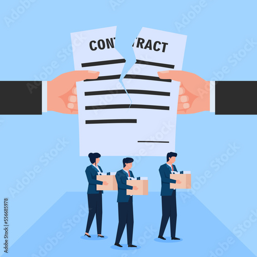 Fototapeta premium Hand tearing contract while employees out of office with their stuff metaphor...