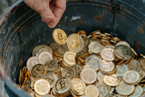 Fototapeta premium Hand Throwing Paper Bitcoins into Trash Bin, Symbolizing Despair and Loss after Investment, Chaotic Concept