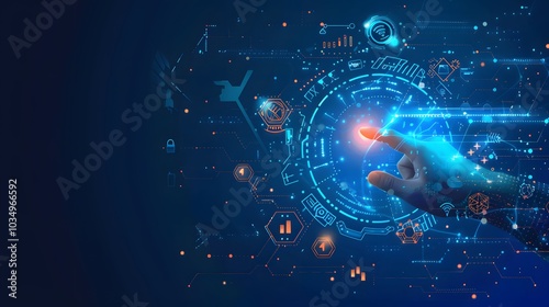 Obraz premium Hand touching a digital screen with icons of technology and online network connection, cloud storage, or security system on a dark blue background