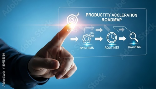 © Umer, Fototapeta premium Hand touching a productivity acceleration roadmap interface with goals and systems steps