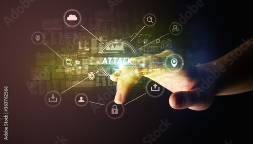 Naklejka premium Hand touching ATTACK inscription, Cybersecurity concept