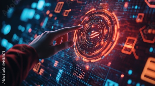 © Mas, Obraz premium Hand touching complex circular diagram on virtual screen with technology abstract Background,
