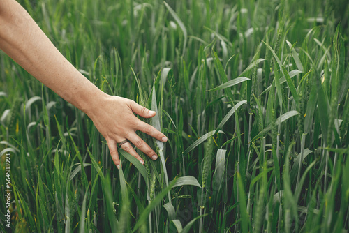 © sonyachny, Obraz premium Hand touching green wheat ears in summer field. Agriculture and cultivation. Woman holding wheat or rye ears in summer countryside. Rural slow life. Food crisis