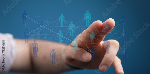 Fototapeta premium Hand touching network of people: representing communication, connection, and social network. Ideal for business