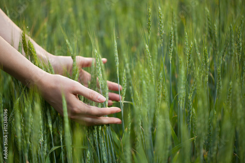 Obraz premium Hand touching wheat field ears