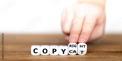 Naklejka premium Hand turns dice and changes the word "copy cat" to "copyright".