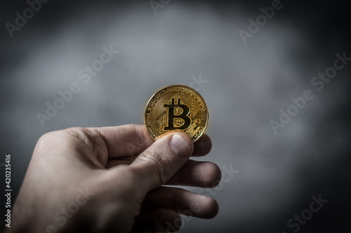 © Johannes, Fototapeta premium Hand with a golden Bitcoin