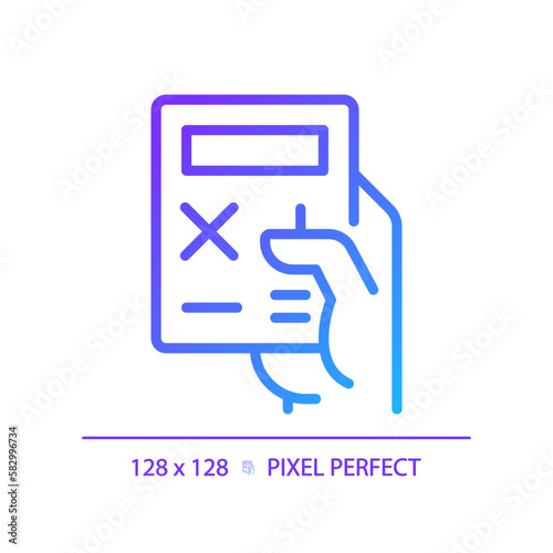 © IMG visuals icons, Fototapeta premium Hand with calculator pixel perfect gradient linear vector icon. Device for counting. Office and school digital tool. Thin line color symbol. Modern style pictogram. Vector isolated outline drawing