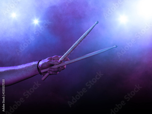 Fototapeta premium Hand with drumsticks on a blue smoky background