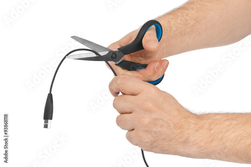 © Nikolai Sorokin, Obraz premium Hand with scissors and computer cable