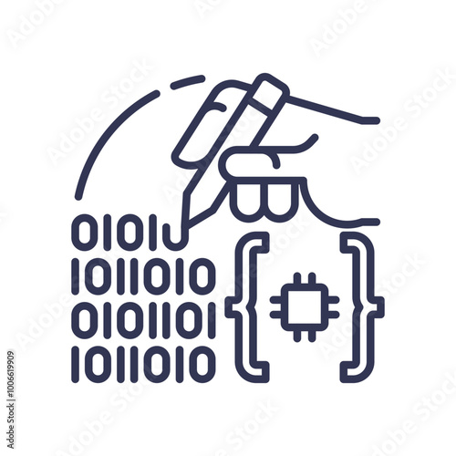 © VectorMine, Obraz premium Hand writing binary code and a microchip, symbolizing AI generation and programming.